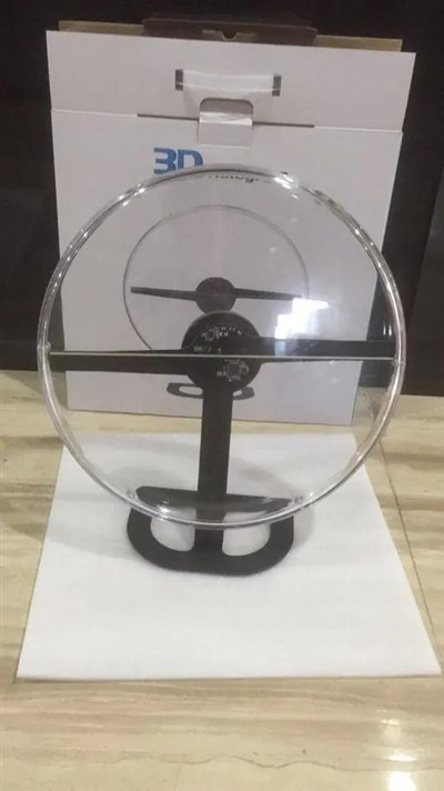 The 30cm holographic fan is made of alloy and ABS material with a round transparent acrylic cover.