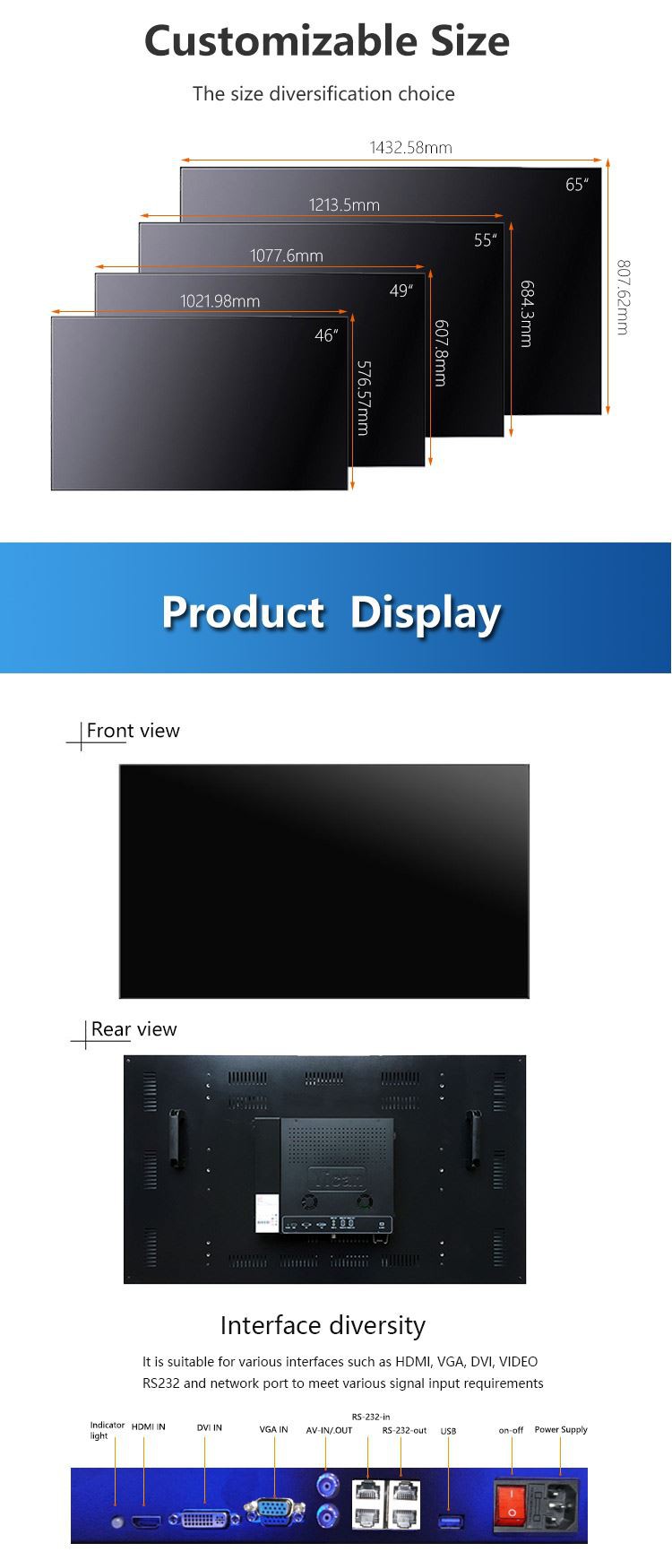 Size: 46'', 49'', 55'', 65''.